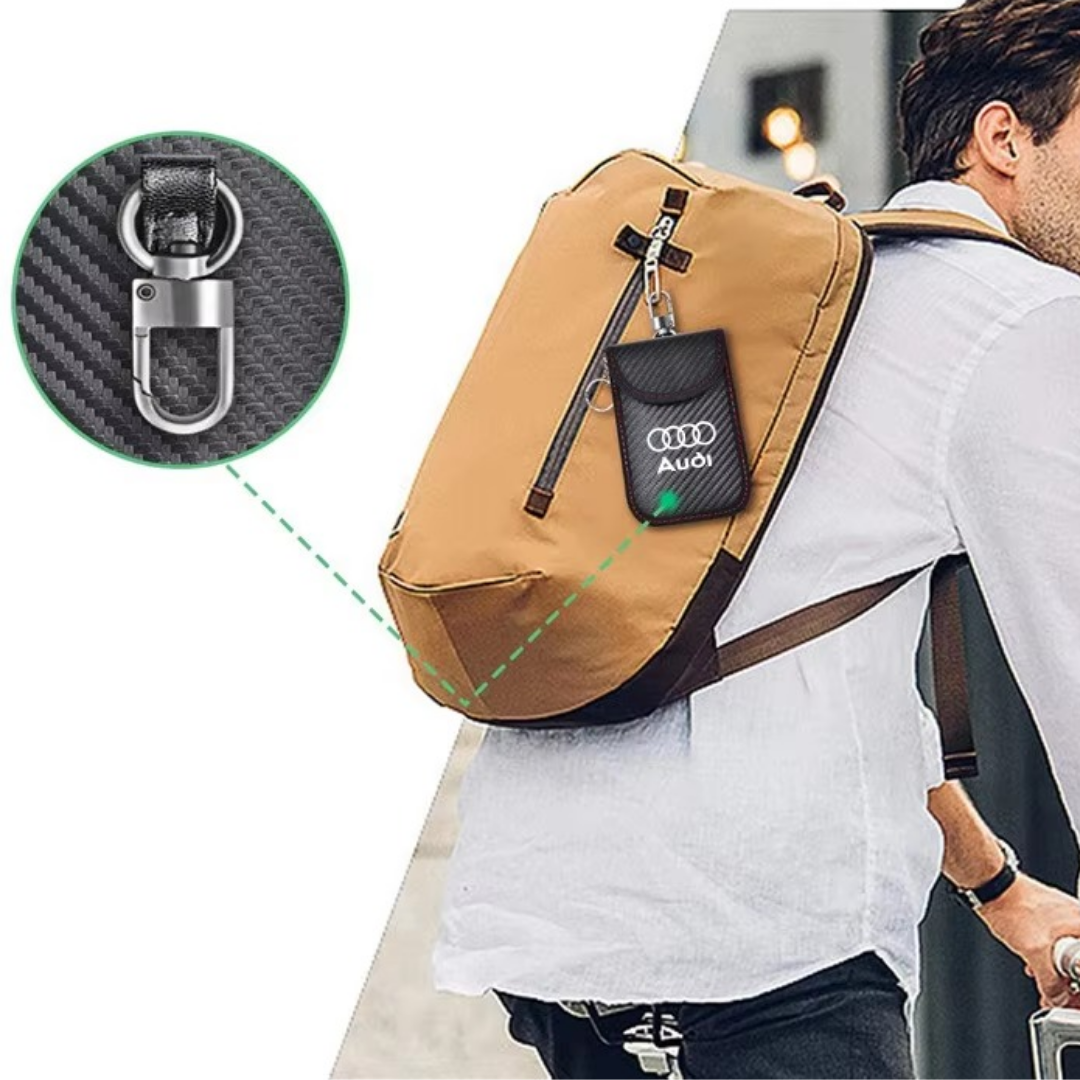 A: The pouch is lined with faraday material that creates a signal-blocking shield around your Audi key fob and cards. When inside, their signals are completely blocked - stopping thieves from intercepting or amplifying them.